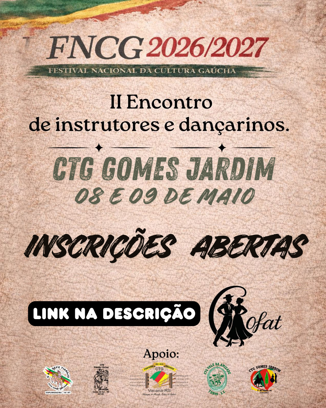 E pensando na preparação dos grupos para esta grande jornada, realizaremos nos dias 08 e 09 de maio, no CTG Gomes Jardim, o II Encontro de Instrutores e Dançarinos do FNCG.